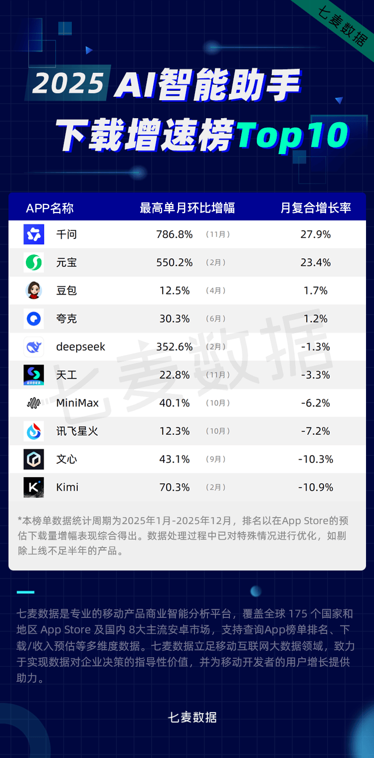 2025年,让AI手艺正在更多细分范畴实现价值落地。「蚂蚁阿福」App月活用户曾经跨越3000万,「豆包」「千问」「元宝」「夸克」「DeepSeek」等15款AI智能帮手强势入榜,展示出了极强的用户接管度和创制活力。