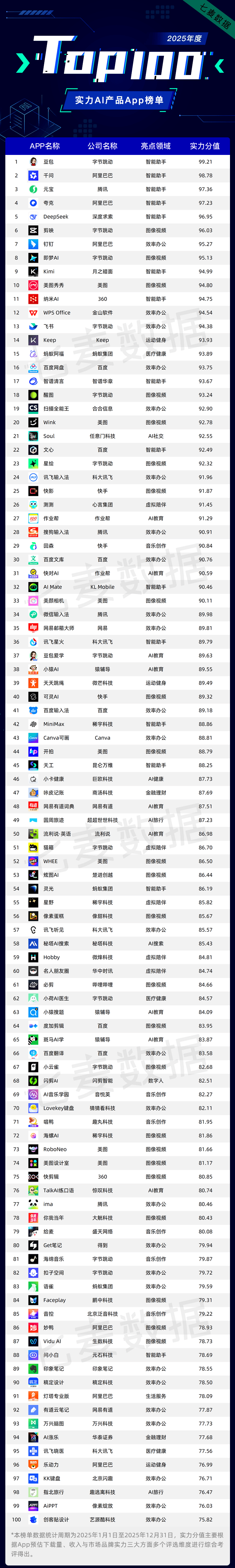 2025年,让AI手艺正在更多细分范畴实现价值落地。「蚂蚁阿福」App月活用户曾经跨越3000万,「豆包」「千问」「元宝」「夸克」「DeepSeek」等15款AI智能帮手强势入榜,展示出了极强的用户接管度和创制活力。
